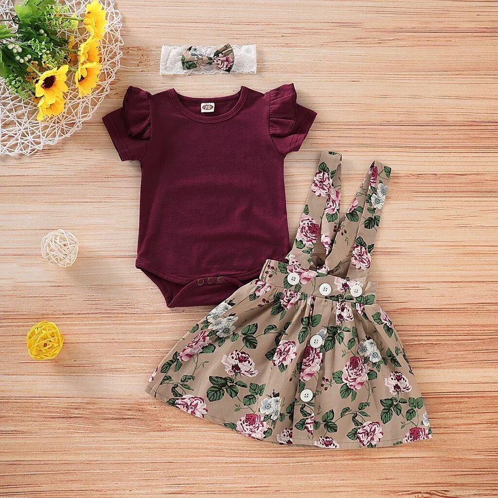 リボンが可愛い、ふんわりフリルのロンパースと花柄のサスペンダースカートがセットに(˶ˊᵕˋ˵)