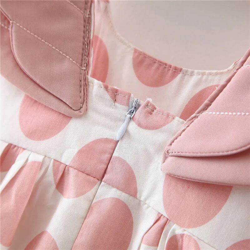 涼しげな水玉模様のワンピースに、かわいらしい天使の羽が施されています。付属の帽子もおしゃれで、全身コーディネートが楽しめます♪̊̈♪̆̈