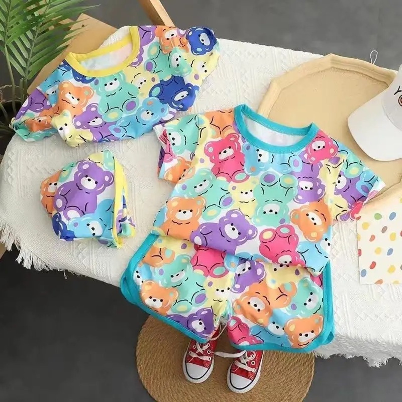 トップスには、「くま」デザインのカラフルプリントが施され、着るだけで気分が高揚♪̊̈♪̆̈